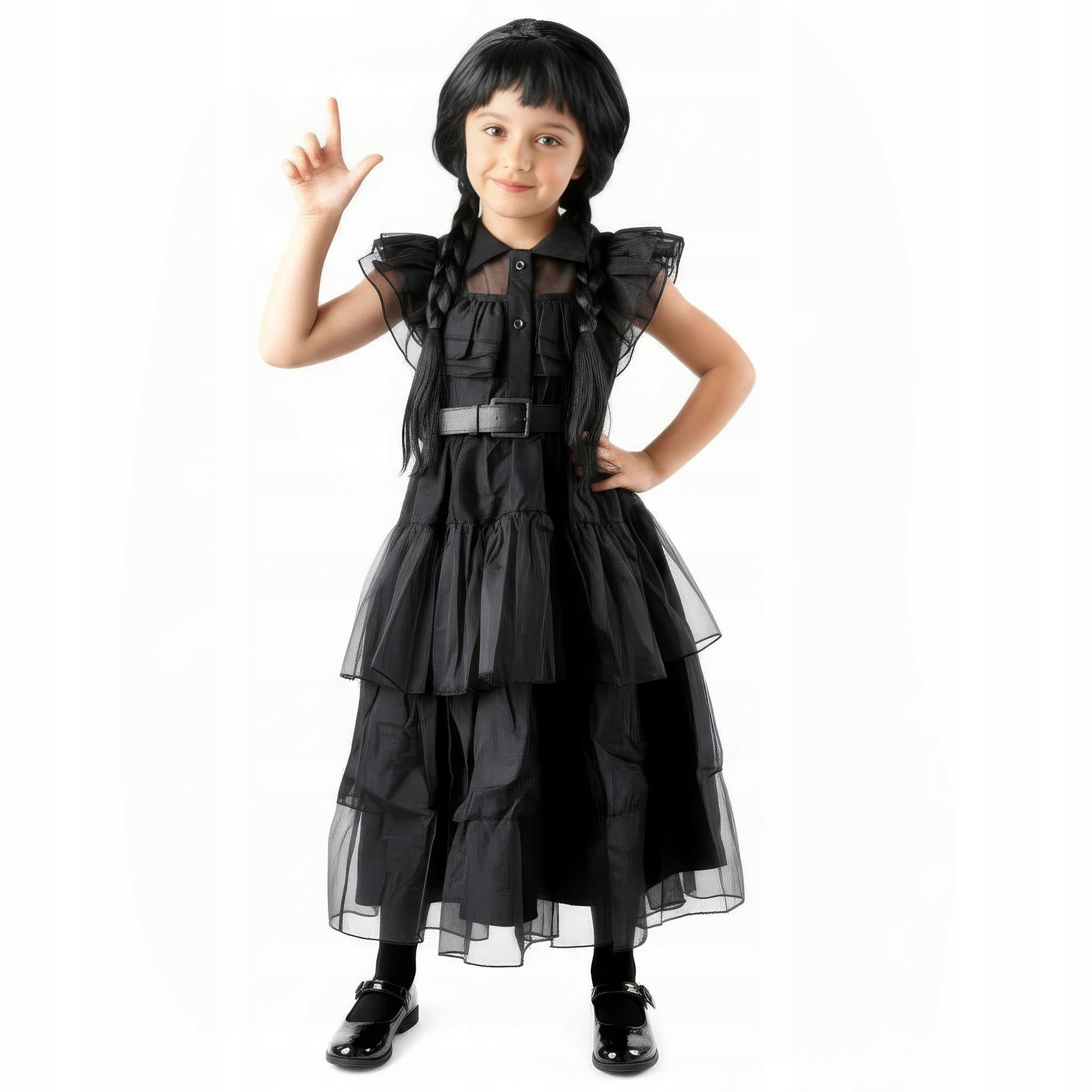 Efektowna sukienka została zaprojektowana z niezwykłą dbałością o detale, dzięki czemu perfekcyjnie oddaje rozpoznawalny styl Wednesday w dziecięcej, eleganckiej odsłonie. Starannie dopracowane tiulowe wykończenia, kontrastowy kołnierzyk oraz warstwowy dół nadają całości lekkości i wyjątkowego charakteru, który od razu przyciąga wzrok. Do zestawu dołączona jest peruka oraz pasek, które harmonijnie uzupełniają stylizację i pozwalają stworzyć kompletny, spójny look gotowy na każdą zabawę.