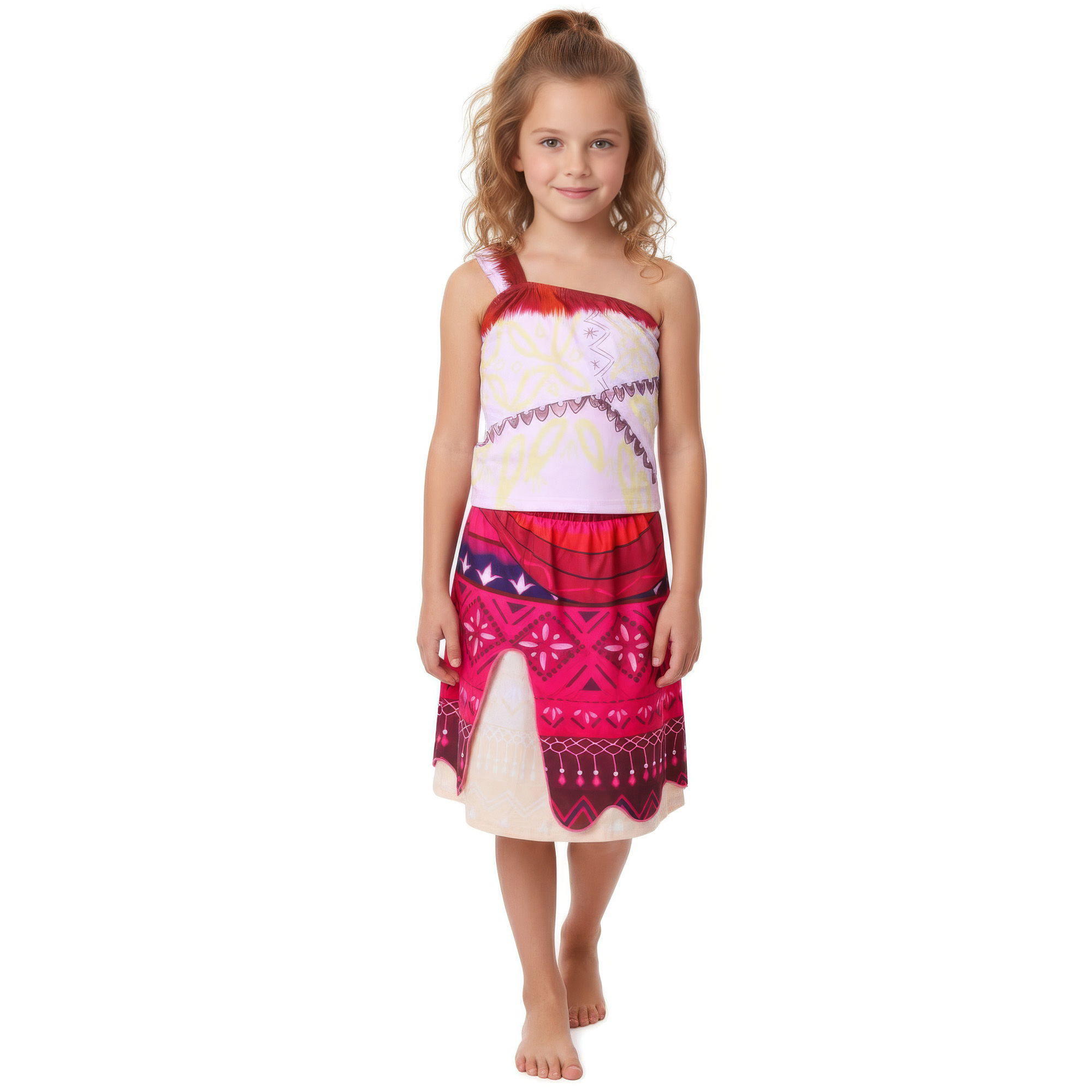 Kolorowy kostium hawajski dla dziewczynki z bajkowymi motywami VAIANA przywodzi na myśl wakacyjny klimat, radość i odwagę w odkrywaniu świata.