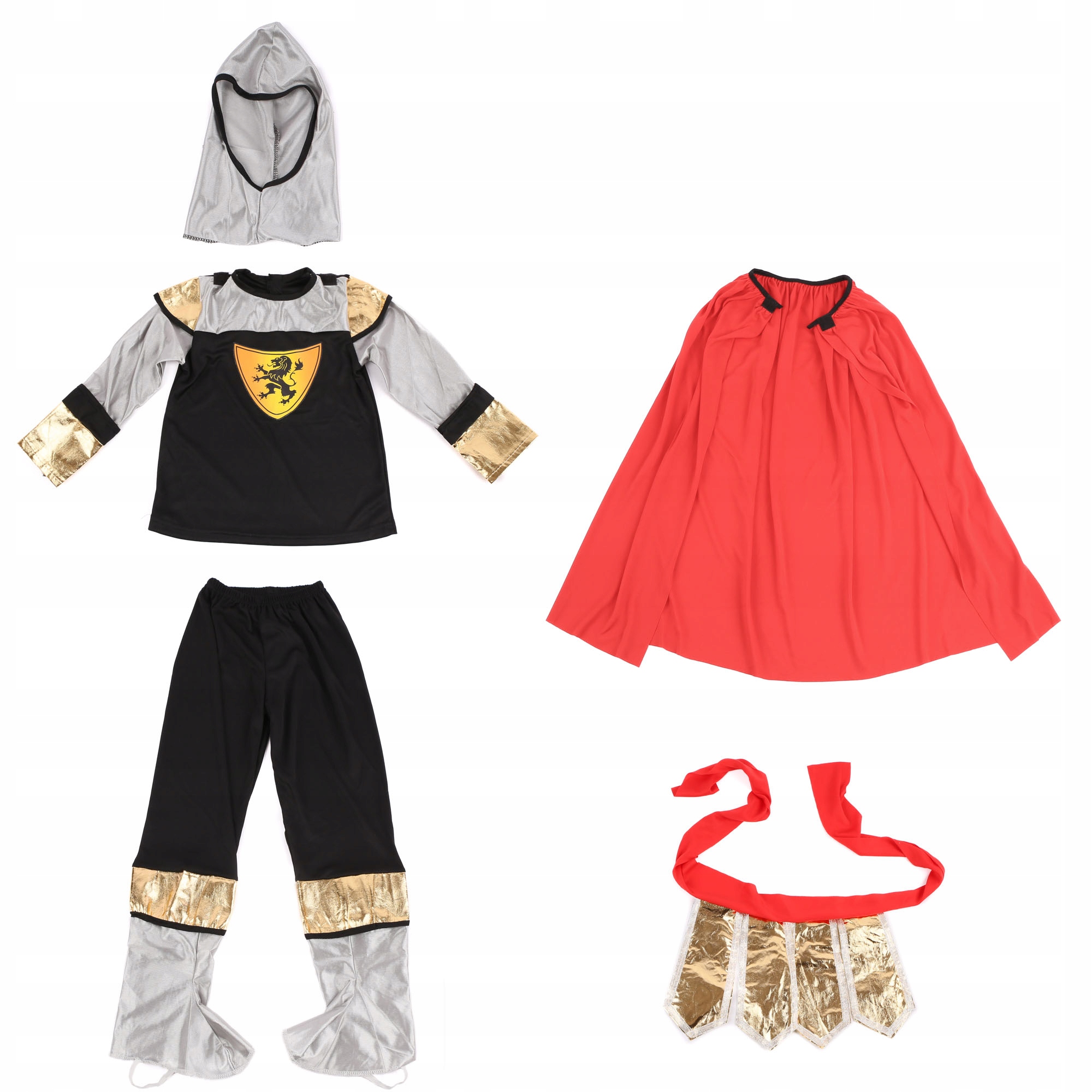 Nogawki i rękawy mają elastyczne wykończenia, które można delikatnie podwinąć, aby idealnie dopasować długość do wzrostu dziecka w danym zakresie rozmiarowym. Dzięki temu kostium zawsze wygląda schludnie i proporcjonalnie, a złote mankiety oraz srebrne osłony tworzą efekt prawdziwej rycerskiej zbroi. To praktyczne rozwiązanie sprawia, że strój zachowuje elegancki wygląd niezależnie od tego, czy nosi go młodszy czy starszy mały rycerz.