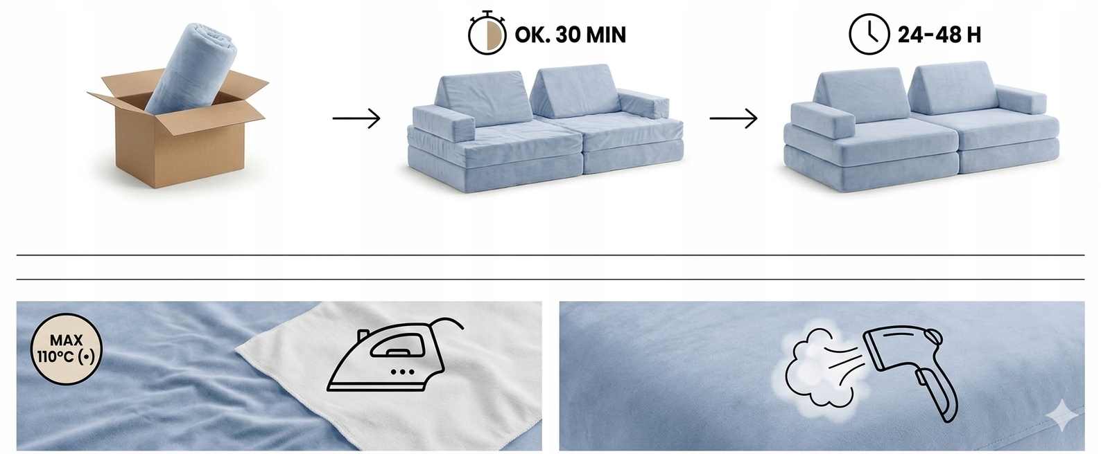 - Pianka rośnie w oczach: Już po około 30 minutach elementy nabiorą swoich docelowych kształtów i będą gotowe do pierwszej zabawy. Pełną puszystość i idealne dopasowanie pokrowców sofa osiąga zazwyczaj w ciągu 24-48 godzin.