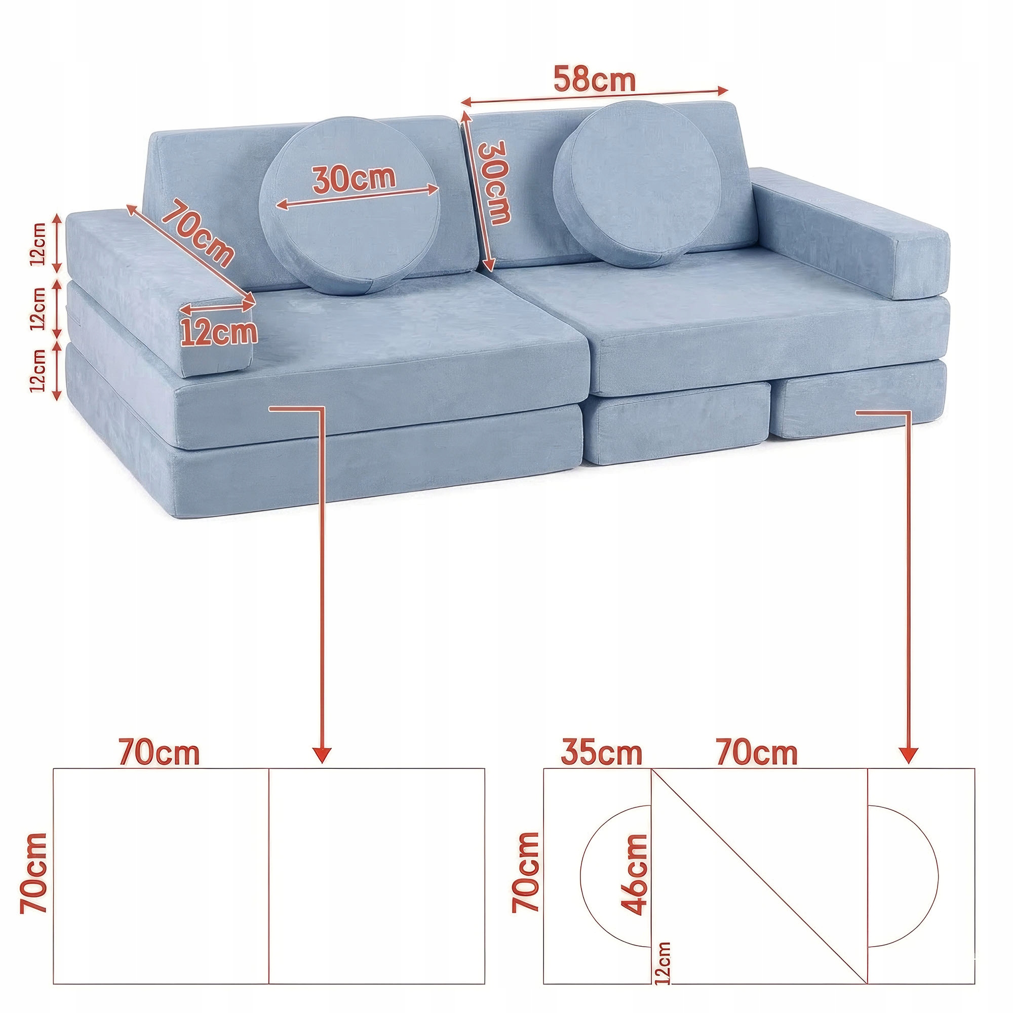 - Elementy wspierające: Duże poduszki oparciowe (30 x 58 cm) zapewniają stabilne oparcie dla pleców, a okrągłe pufki (30 cm) służą jako dodatkowe siedziska lub klocki.