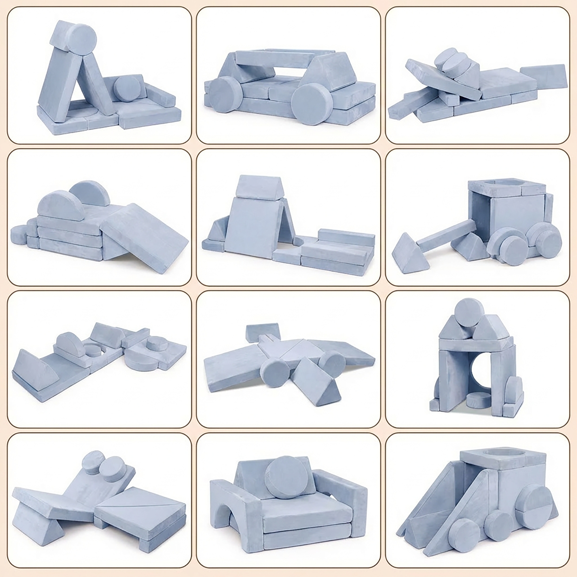 - Wielofunkcyjność: Zestaw składa się z różnorodnych brył, które w kilka sekund zamienią się z wygodnego siedziska w tor przeszkód lub bazę.