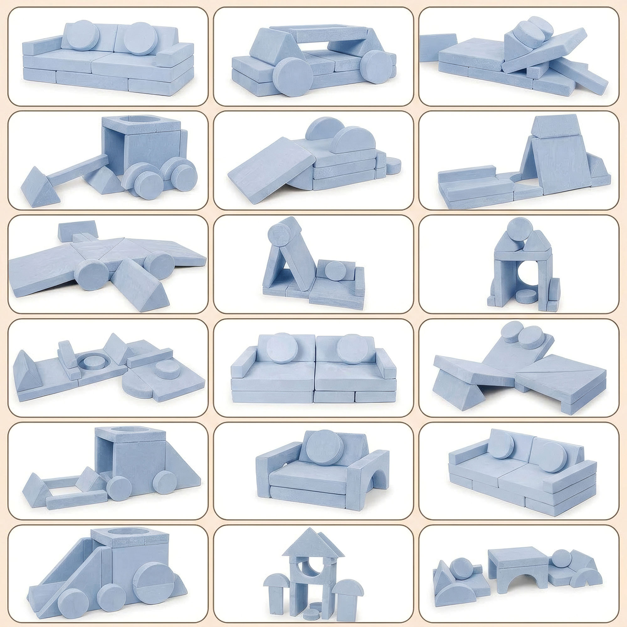 - 2 Trójkątne Oparcia: Stabilne klocki, które służą jako wygodne plecy sofy lub dach zamku.