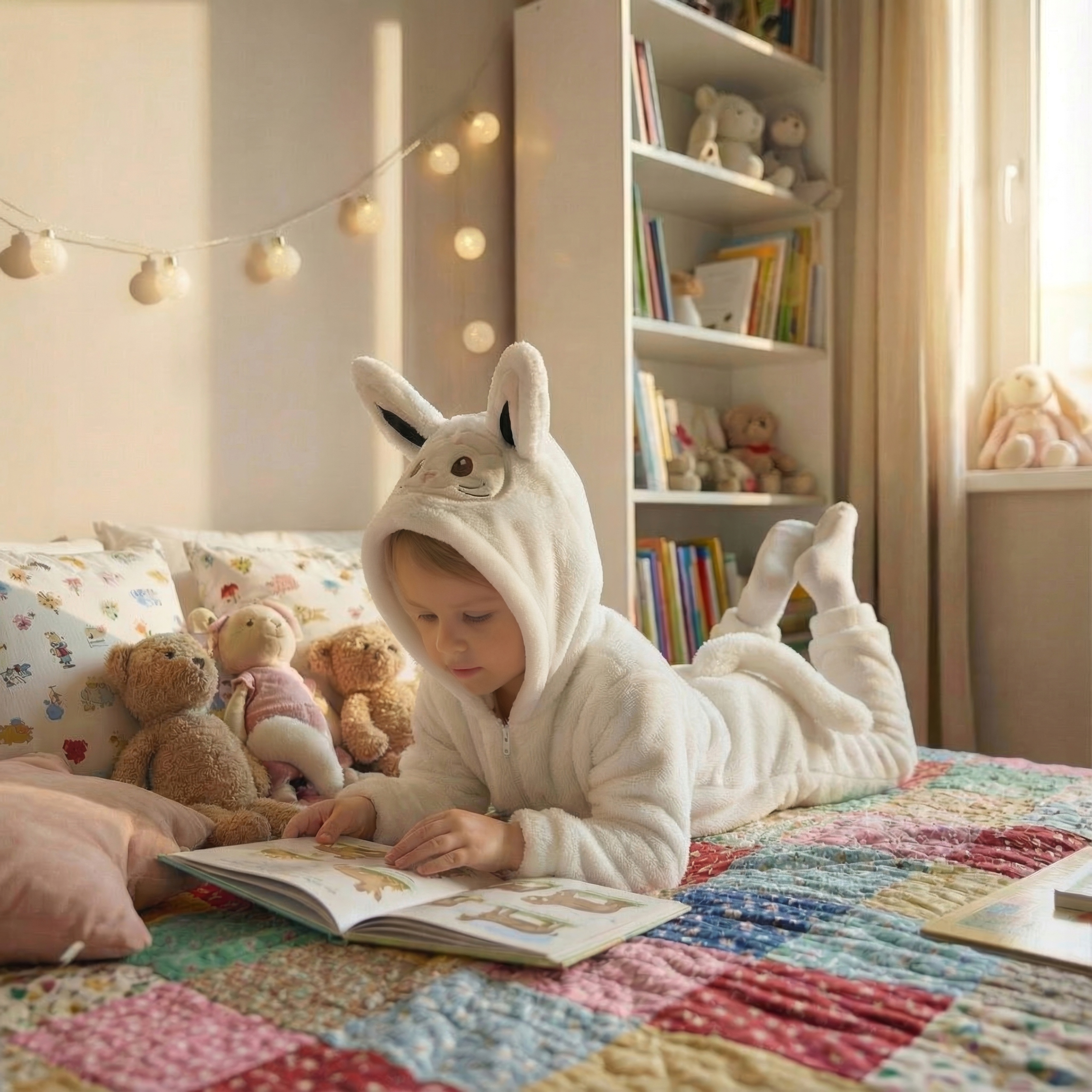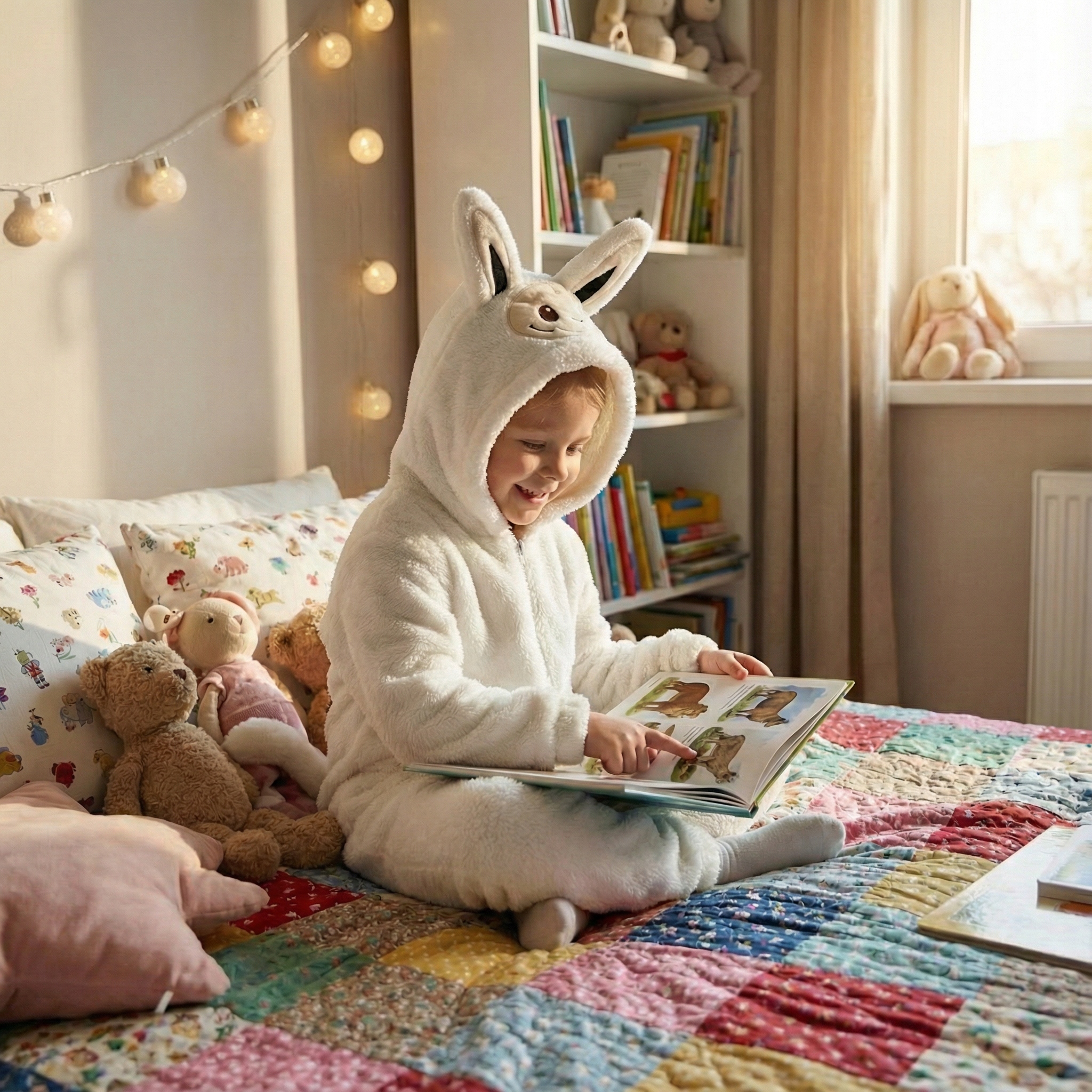 Swobodny krój nie krępuje ruchów, pozwala wygodnie usiąść, położyć się i bawić na podłodze, a przytulna forma daje poczucie ciepła i bezpieczeństwa. Dzieci bardzo szybko się do niego przywiązują – często nie chcą go zdejmować, traktując go jak swój ulubiony domowy strój, w którym czują się komfortowo i „po swojemu”.
