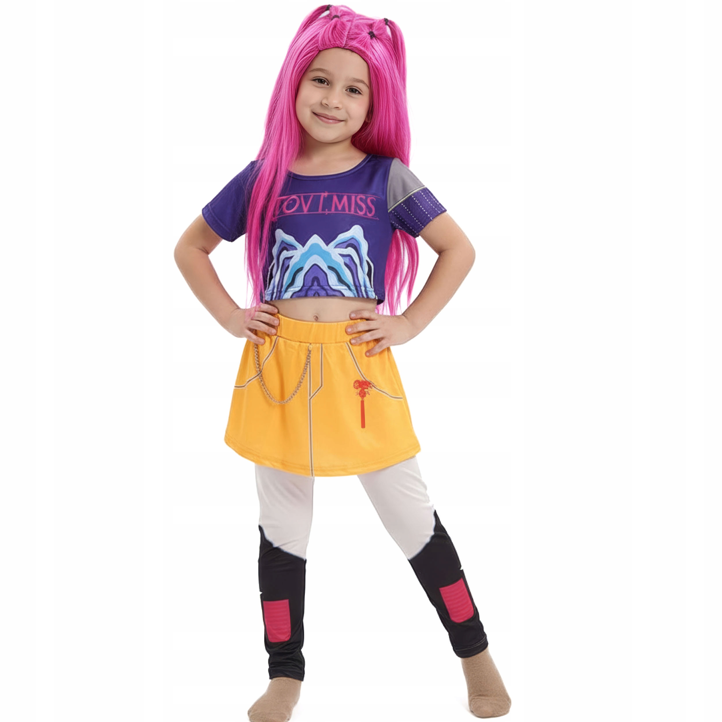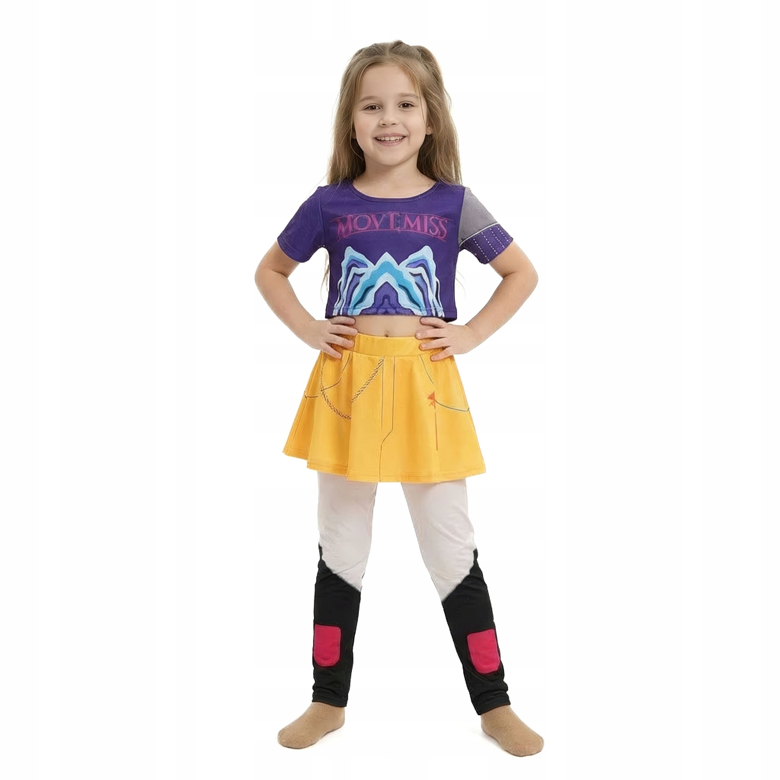 - Designerski dół: Żółta spódniczka połączona z dopasowanymi legginsami, zapewniająca pełną swobodę ruchów. Wyraziste wzory i detale sprawiają, że każda fanka poczuje się jak prawdziwa gwiazda zespołu K-popowego.