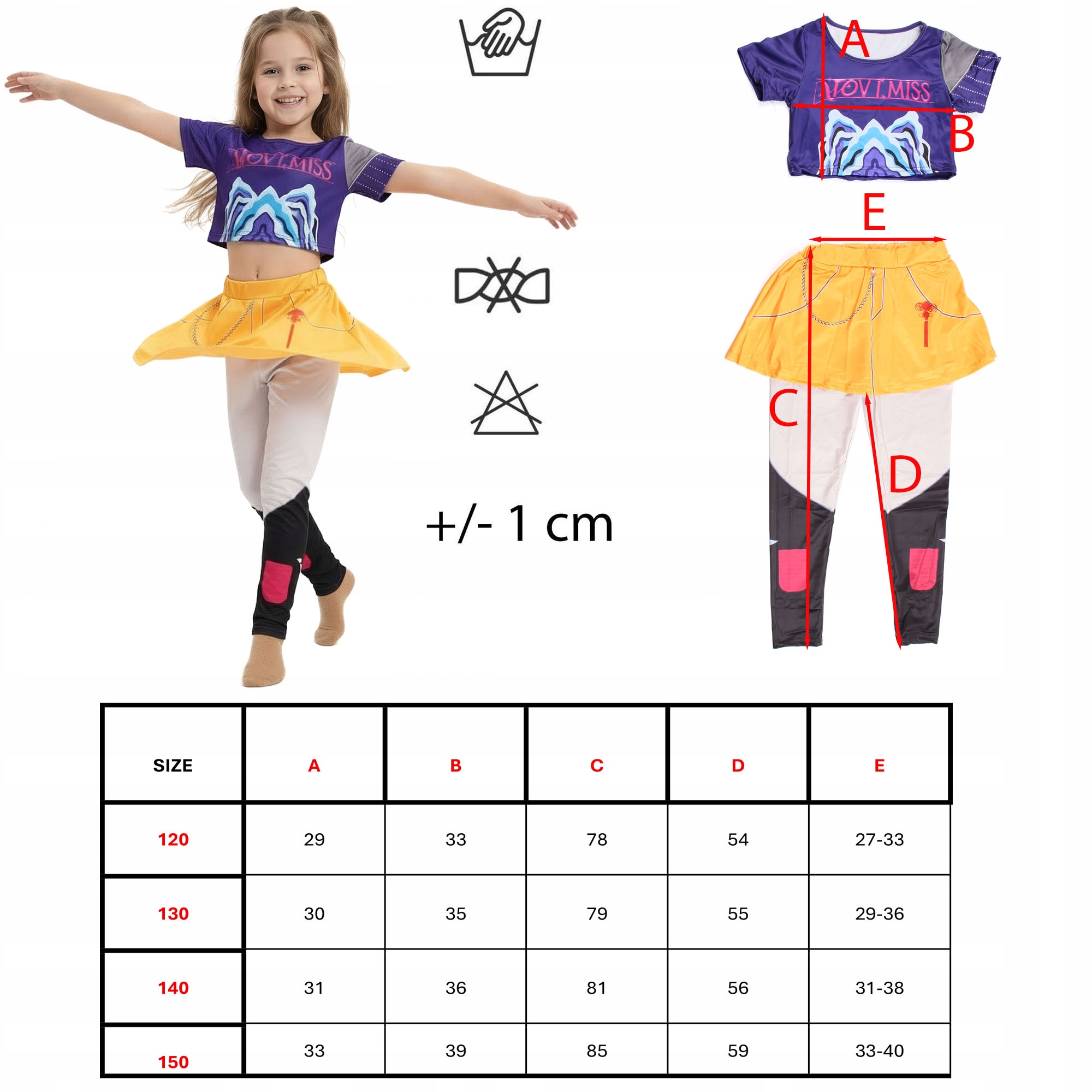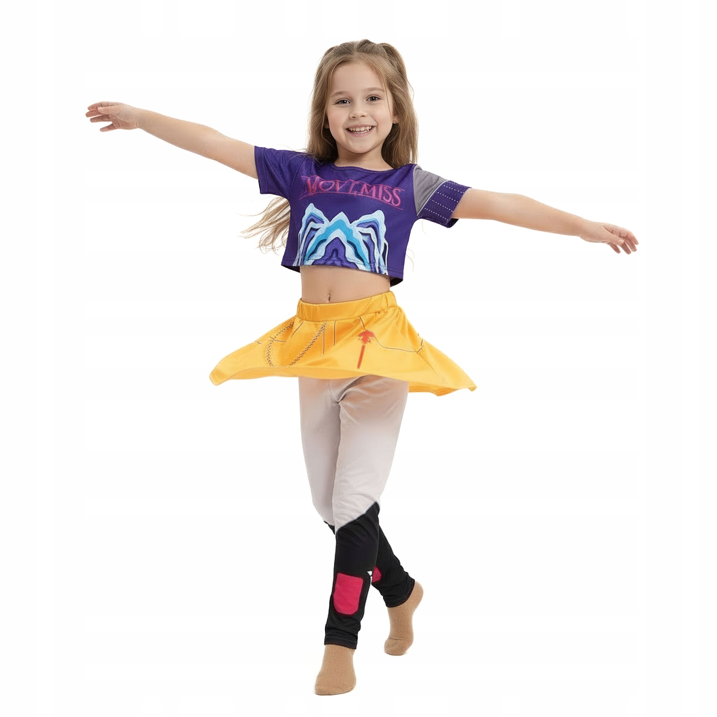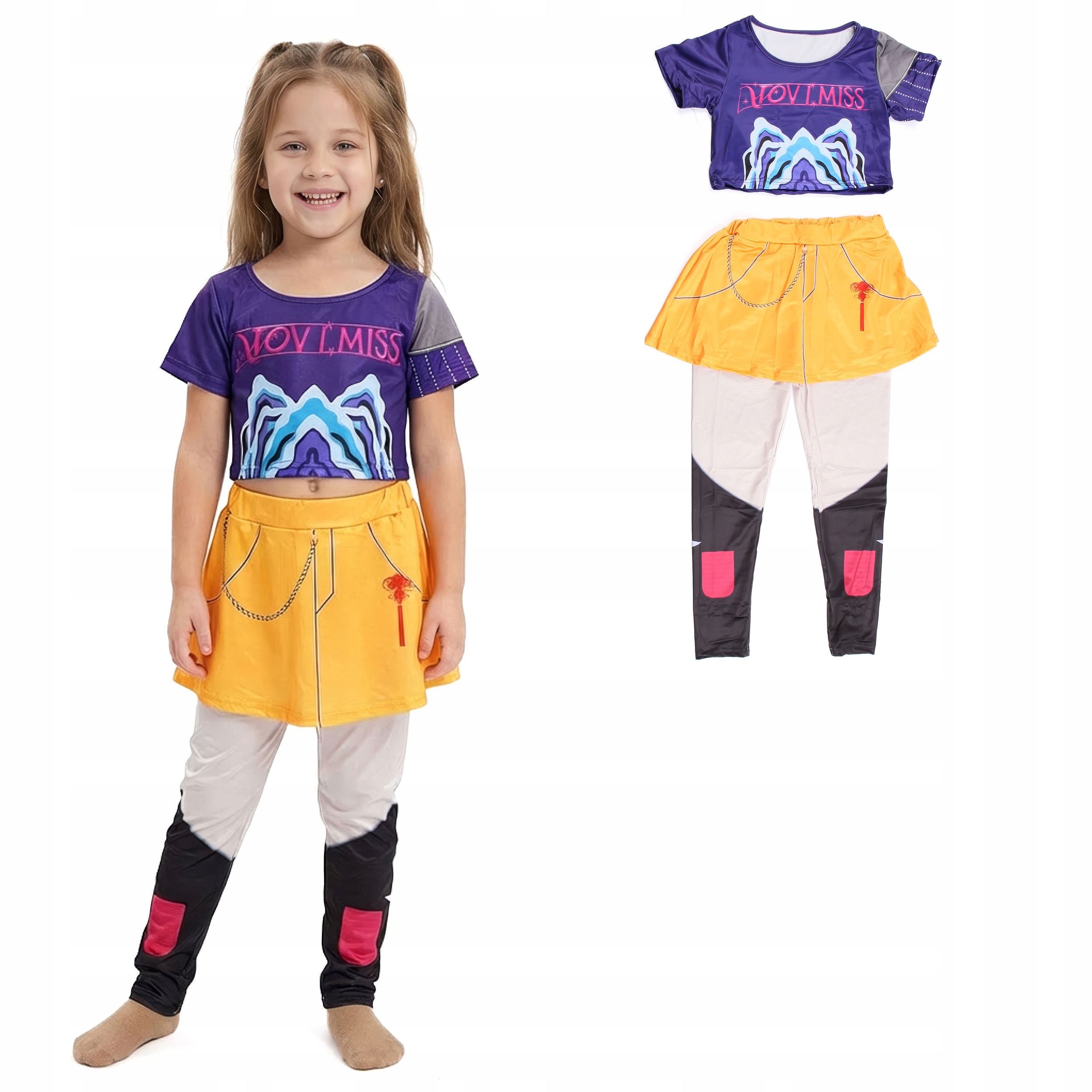 ✅ Kompletny zestaw 2-częściowy: Wygodny, fioletowy top z nadrukiem i żółta spódniczka z doszytymi legginsami imitującymi wysokie buty.