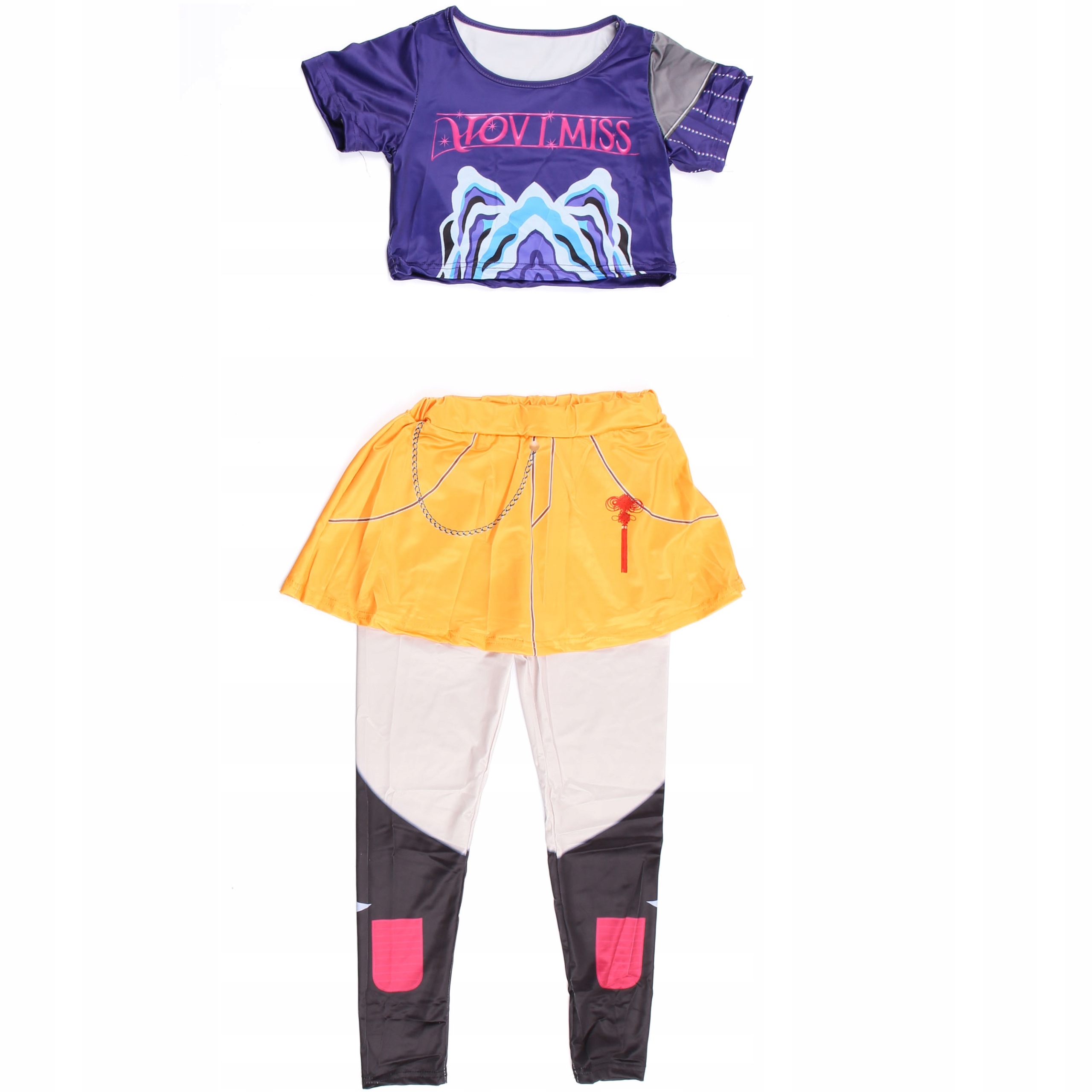 - Dół: żółta spódniczka z doszytymi legginsami, wyróżniająca się geometrycznymi wzorami i ozdobnymi elementami.
