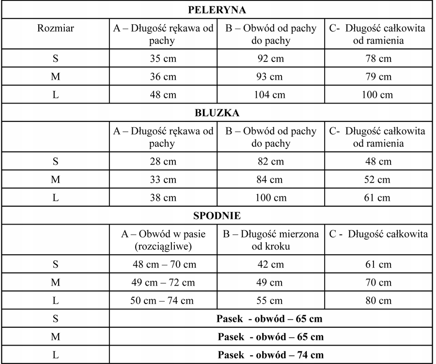 RozmiarWiekBluzka -długość całkowitaBluzka - obwód pod pachamiBluzka - długość rękawaPeleryna - długość całkowitaPeleryna-obwód pod pachamiPeleryna-długość rękawaSpodnie-długośćSpodnie-długość od krokuSpodnie-obwód w pasie (rozciągliwe))Pas - obwód
